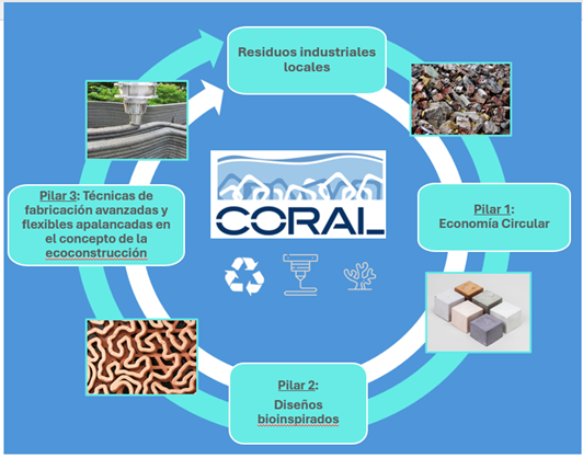 En CORAL se plantea la investigación de nuevas soluciones de ecoingeniería basadas en la naturaleza para la restauración costera y de la biodiversidad marina que se fundamenta en 3 pilares sinérgicos: 1) Economía Circular; 2) Diseños bio-inspirados, 3) Técnicas de fabricación avanzadas y flexibles apalancadas en el concepto de la ecoconstrucción. Los principales desafíos e innovaciones son: la valorización de residuos locales, el diseño de morteros sostenibles e imprimibles libres de cemento Portland y la biomímesis mediante impresión 3D para la restauración de ecosistemas costeros.